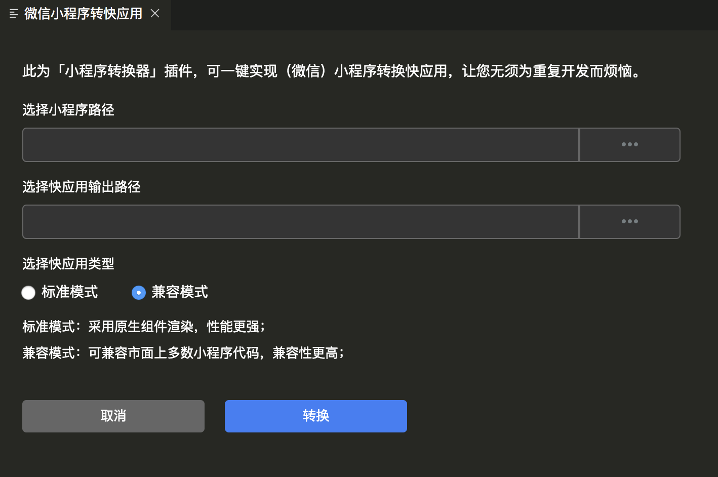 微(wēi)信小(xiǎo)程序轉換快(kuài)應用(yòng)(兼容版)也(yě₽¥δ)支持兩種形式轉換